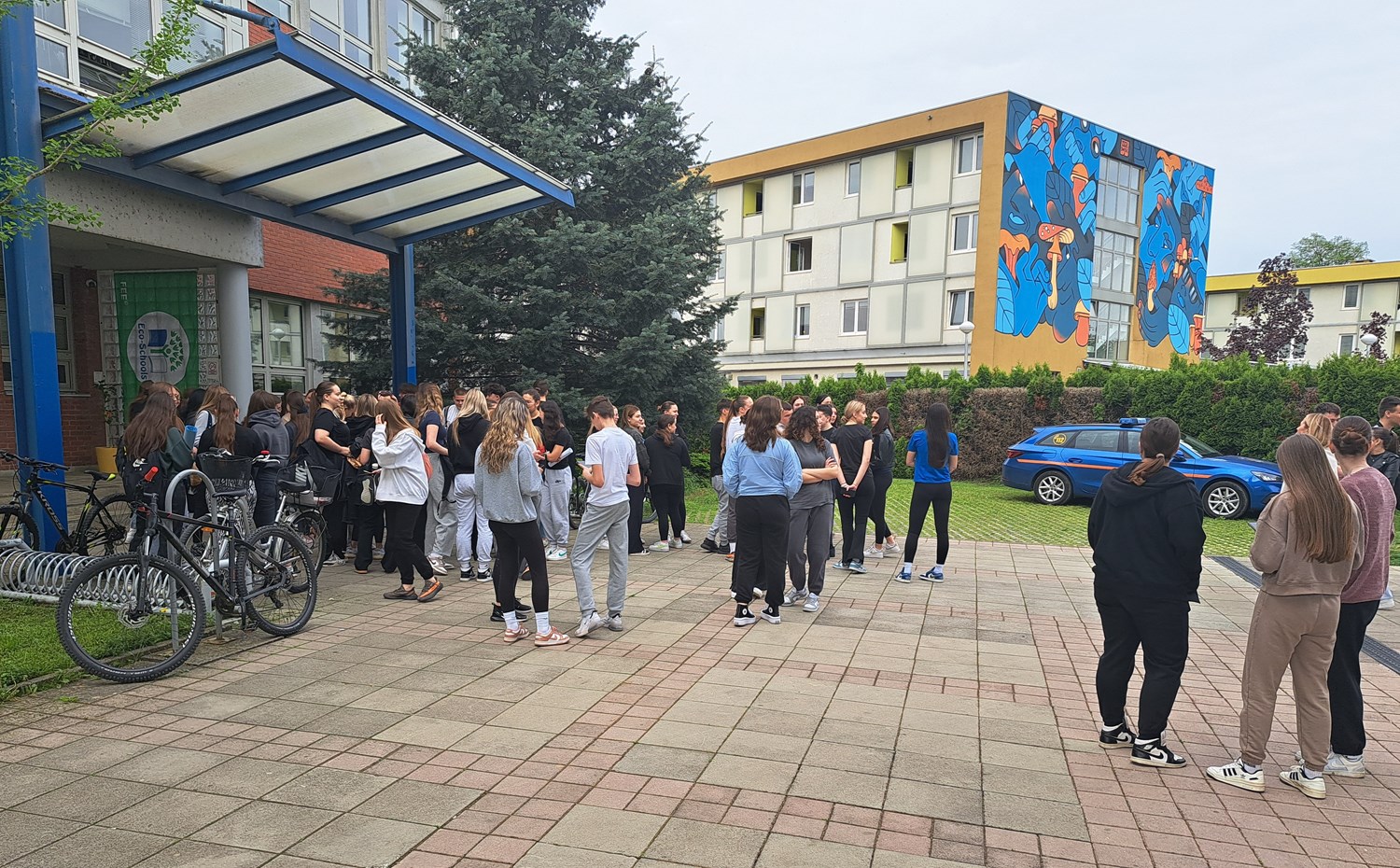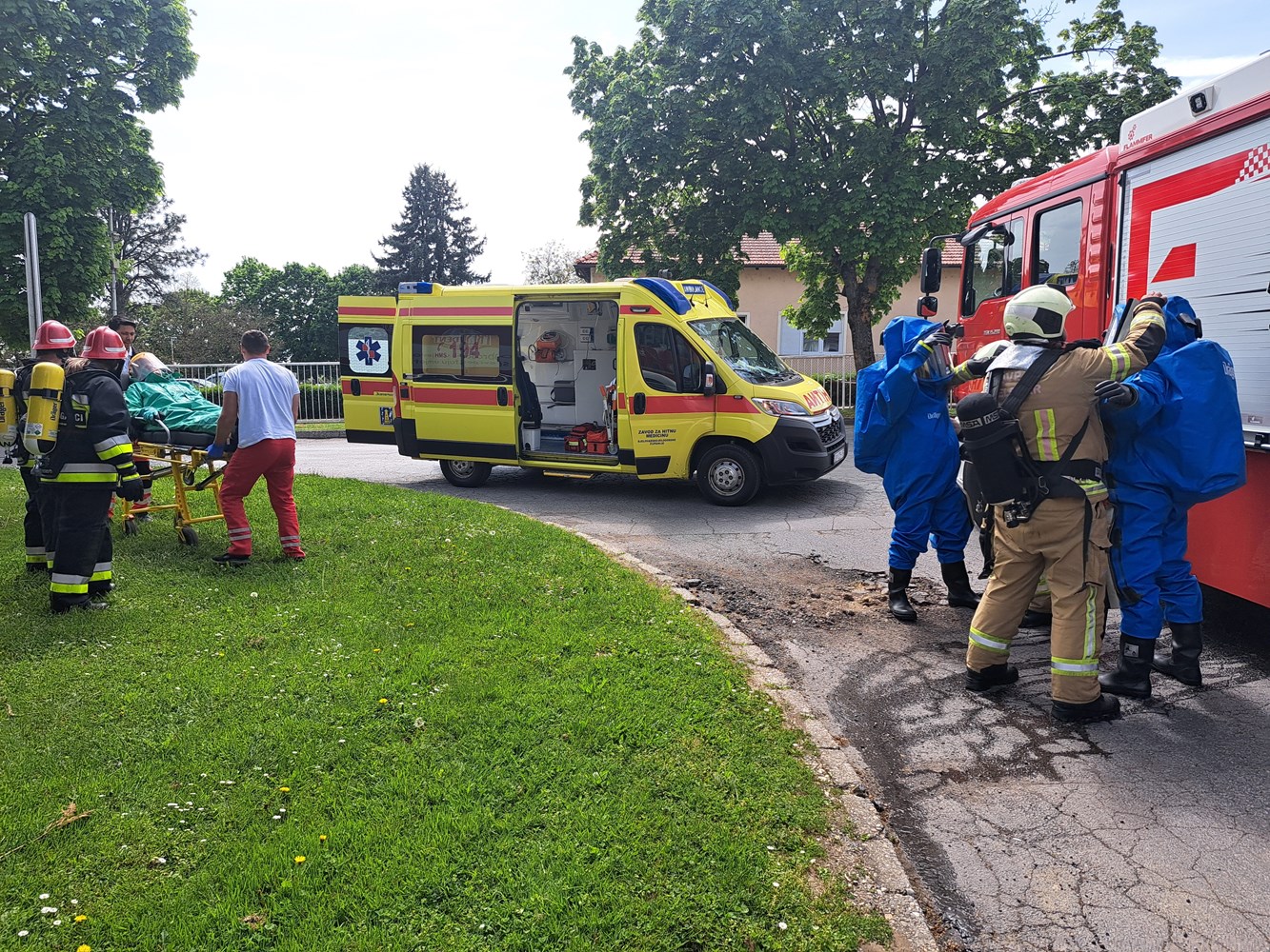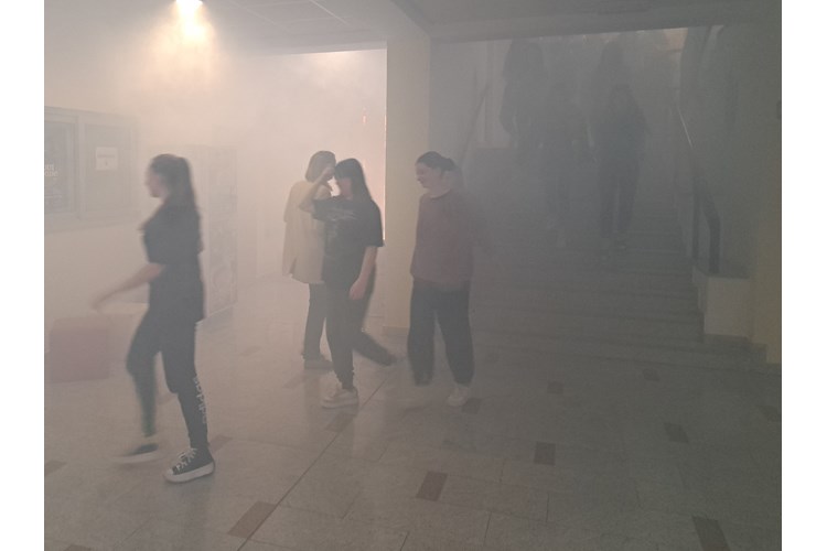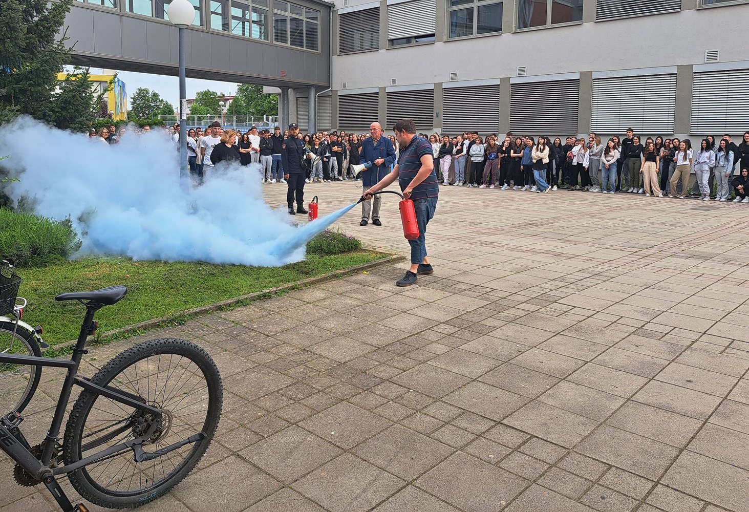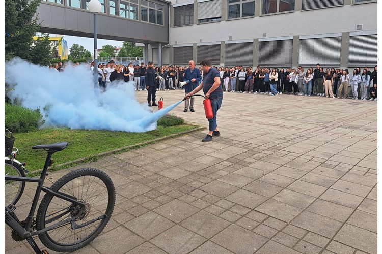 Foto: MUPVježba evakuacije i spašavanja učenika i zaposlenika održana je u Bjelovaru te je uključivala četiri srednje škole: Medicinsku školu, Ekonomsku i birotehničku školu, Komercijalnu i trgovačku školu te Turističko-ugostiteljsku i prehrambenu školu. Prema scenariju vježbe izbio je požar u holu medicinske škole te se uvježbavalo evakuiranje učenika i zaposlenika škola. Nakon vježbe demonstrirano je gašenje požara protupožarnim aparatom.