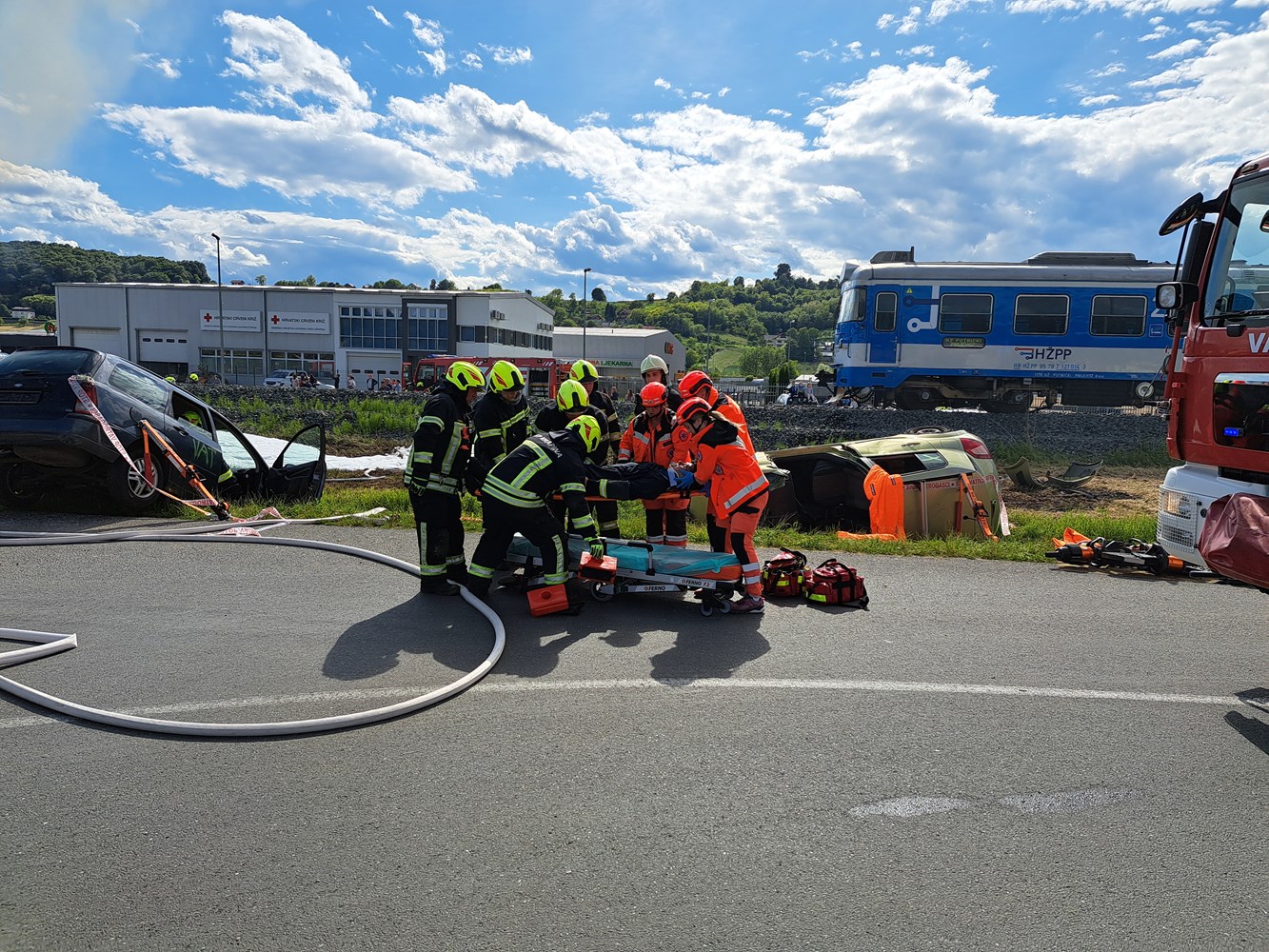 Foto: MUPVježbu je organiziralo Dobrovoljno vatrogasno društvo Krapina u svrhu poboljšanja zajedničkog djelovanja hitnih službi, protokola te poboljšanja znanja i vještina. Prema scenariju, putnički vlak je udario autobus koji se prevrnuo uz željezničku prugu što je izazvalo pucanje spremnika za gorivo na vlaku.