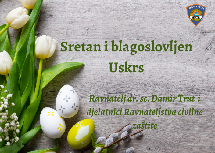 Svim djelatnicama i djelatnicima Ravnateljstva civilne zaštite, Ministarstva unutarnjih poslova, sudionicima i pripadnicima operativnih snaga sustava civilne zaštite, želimo miran i blagoslovljen Uskrs!