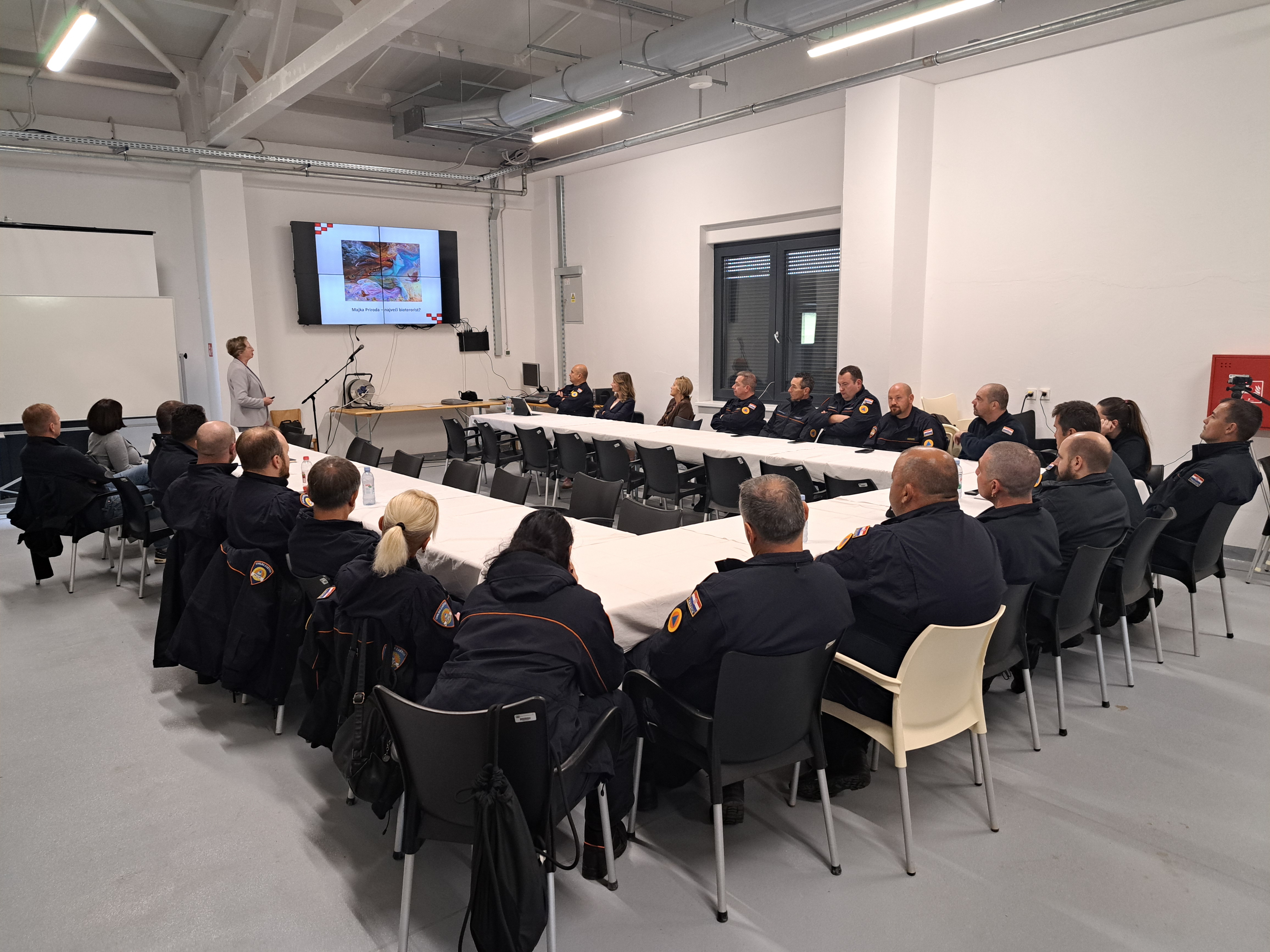 Foto: MUPU Nastavnom nacionalnom središtu civilne zaštite u Jastrebarskom 14. listopada za pripadnike Državne intervencijske postrojbe civilne zaštite prof. dr. sc. Alemka Markotić održala je predavanje na temu opasnosti od zaraznih bolesti koje mogu biti izazvane ratnim ili terorističkim djelovanjem, a dr. med. vet. Ivana Lohman Janković iz Uprave za veterinarstvo i sigurnost hrane Ministarstva poljoprivrede, šumarstva i ribarstva na temu zaraznih bolesti kod životinja, mjerama zaštite ljudi i dezinfekcija prostora.