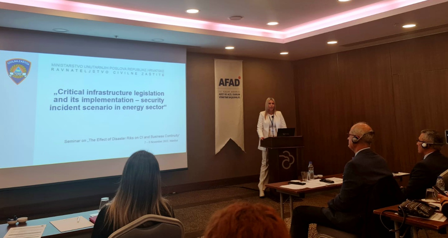Na seminaru sudjeluju Dražen Štajduhar, načelnik Sektora za smanjenje rizika od katastrofa i Ivana Cesarec, voditeljica Odjela za kritičnu infrastrukturu i kulturnu baštinu koja je održala prezentaciju "Legislativni okvir RH i njegova implementacija - scenarij sigurnosnog incidenta u energetskom sektoru".
