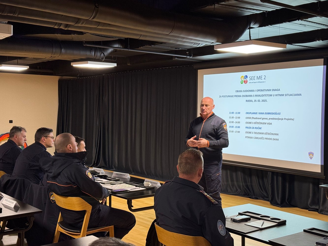 Događanju je prisustvovao i sudionicima se obratio ravnatelj Ravnateljstva civilne zaštite dr. sc. Damir Trut koji je naglasio važnost ove inicijative koja direktno doprinosi razvoju sigurnijeg i inkluzivnijeg društva, pri tome ističući kako Ravnateljstvo civilne zaštite kontinuirano djeluje u ovom području jer je projekt SEE ME 2 nastavak uspješno završenog projekta SEE ME 1, a temelji se na sigurnosti i jednakosti osoba s invaliditetom u hitnim situacijama.
