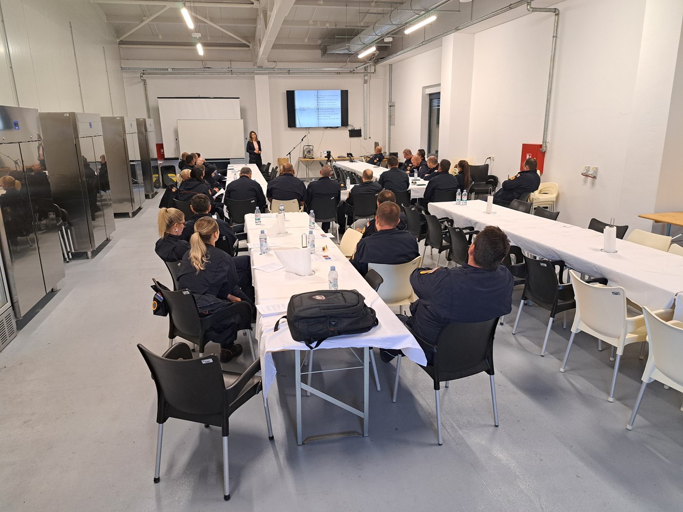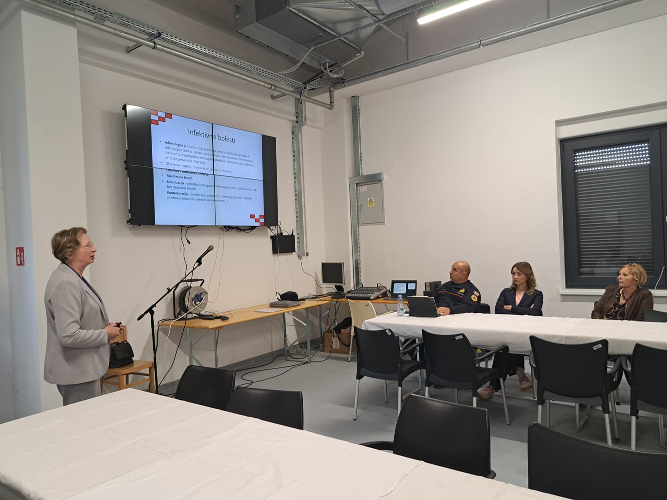 Foto: MUPU Nastavnom nacionalnom središtu civilne zaštite u Jastrebarskom 14. listopada za pripadnike Državne intervencijske postrojbe civilne zaštite prof. dr. sc. Alemka Markotić održala je predavanje na temu opasnosti od zaraznih bolesti koje mogu biti izazvane ratnim ili terorističkim djelovanjem, a dr. med. vet. Ivana Lohman Janković iz Uprave za veterinarstvo i sigurnost hrane Ministarstva poljoprivrede, šumarstva i ribarstva na temu zaraznih bolesti kod životinja, mjerama zaštite ljudi i dezinfekcija prostora.
